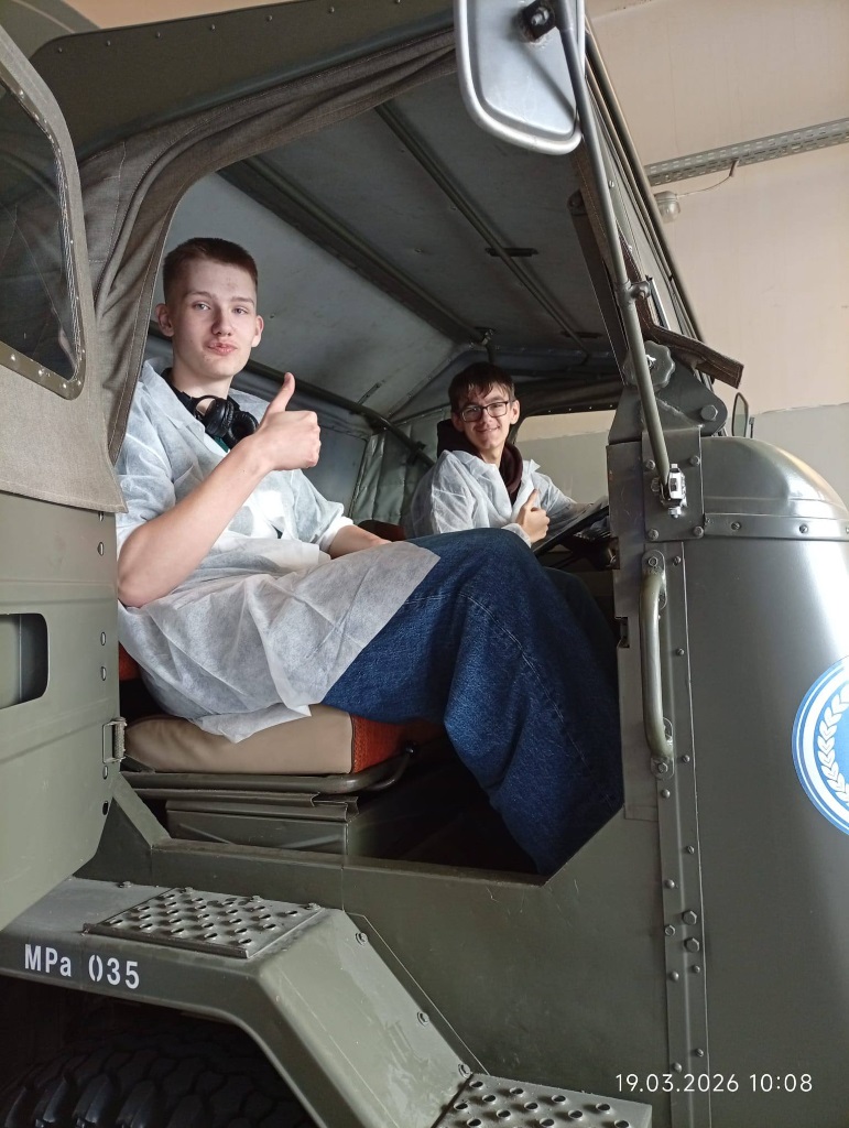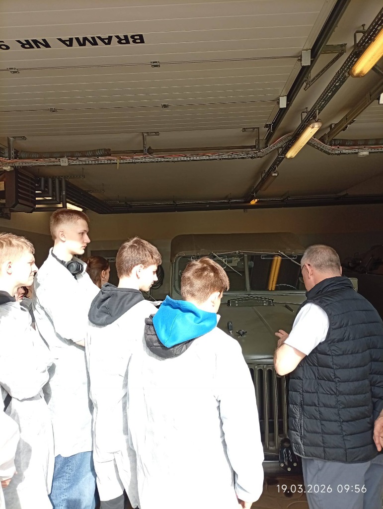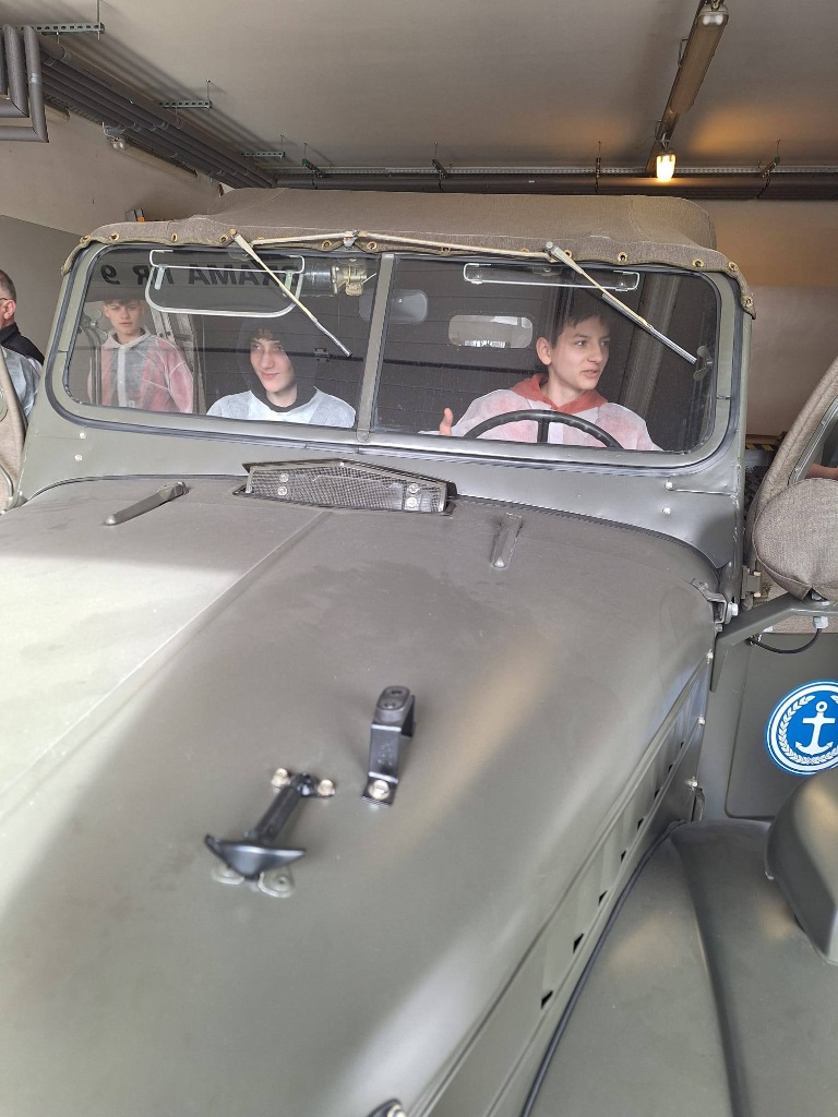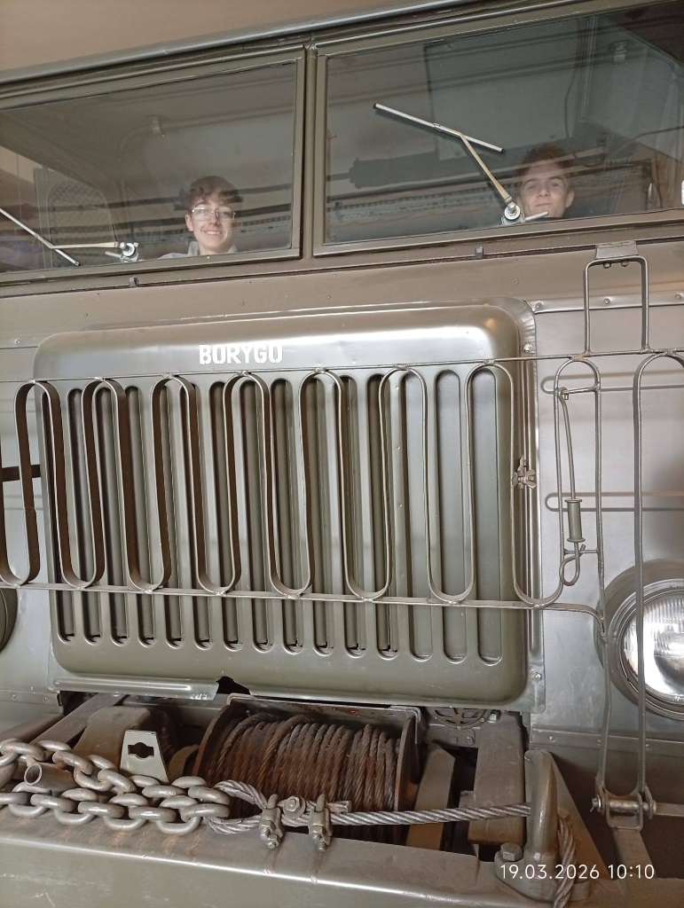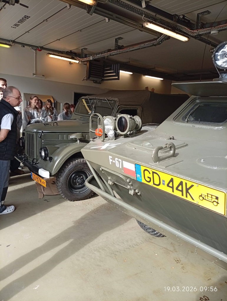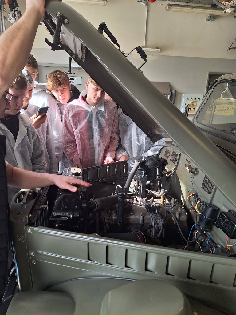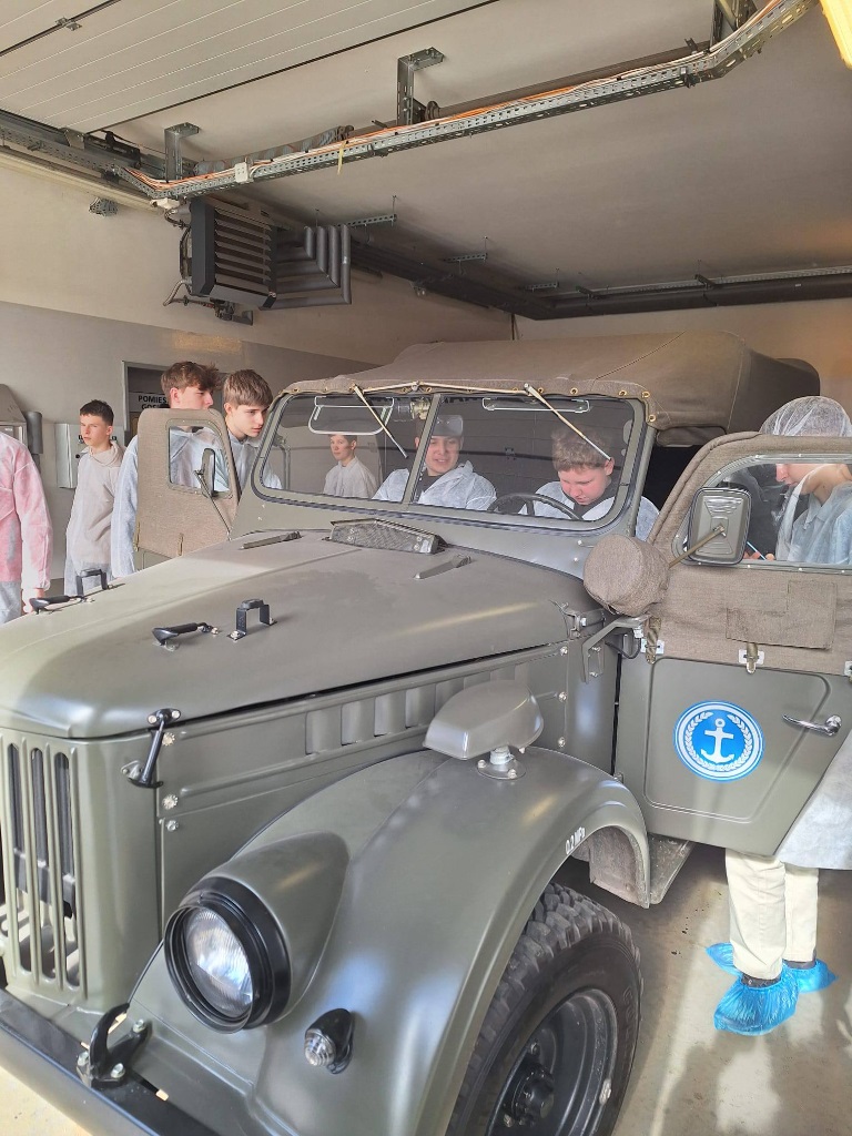 Na uczestników czekały również wyjątkowe atrakcje. Oprócz degustacji i obserwacji pracy w piekarni, uczniowie podziwiali imponującą kolekcję zabytkowych pojazdów wojskowych należących do pana Grzegorza Pellowskiego – w jednym z nich znajdowała się polowa piekarnia, co wzbudziło ogromne zainteresowanie i było niezwykle ciekawą lekcją historii oraz zawodu.