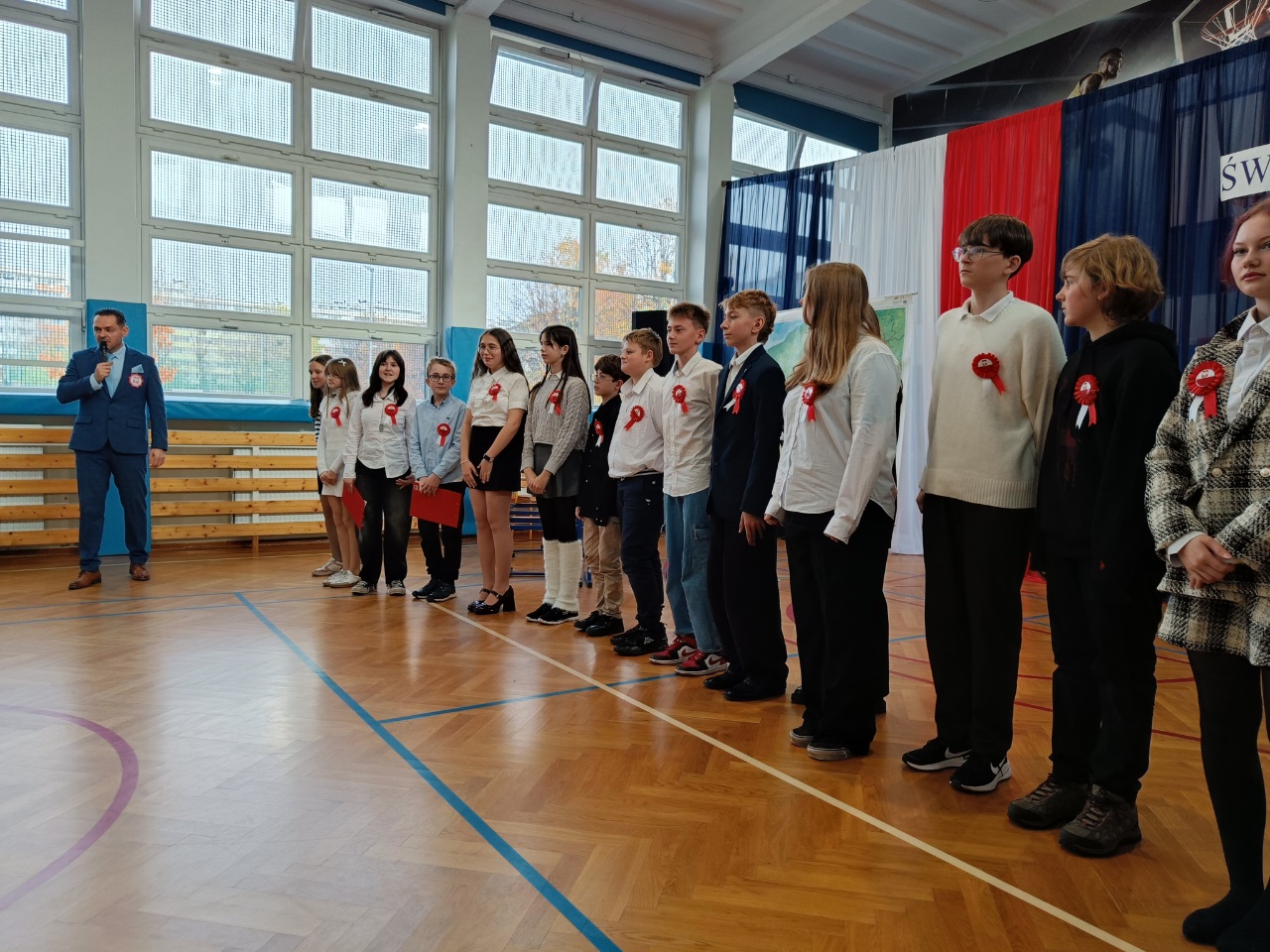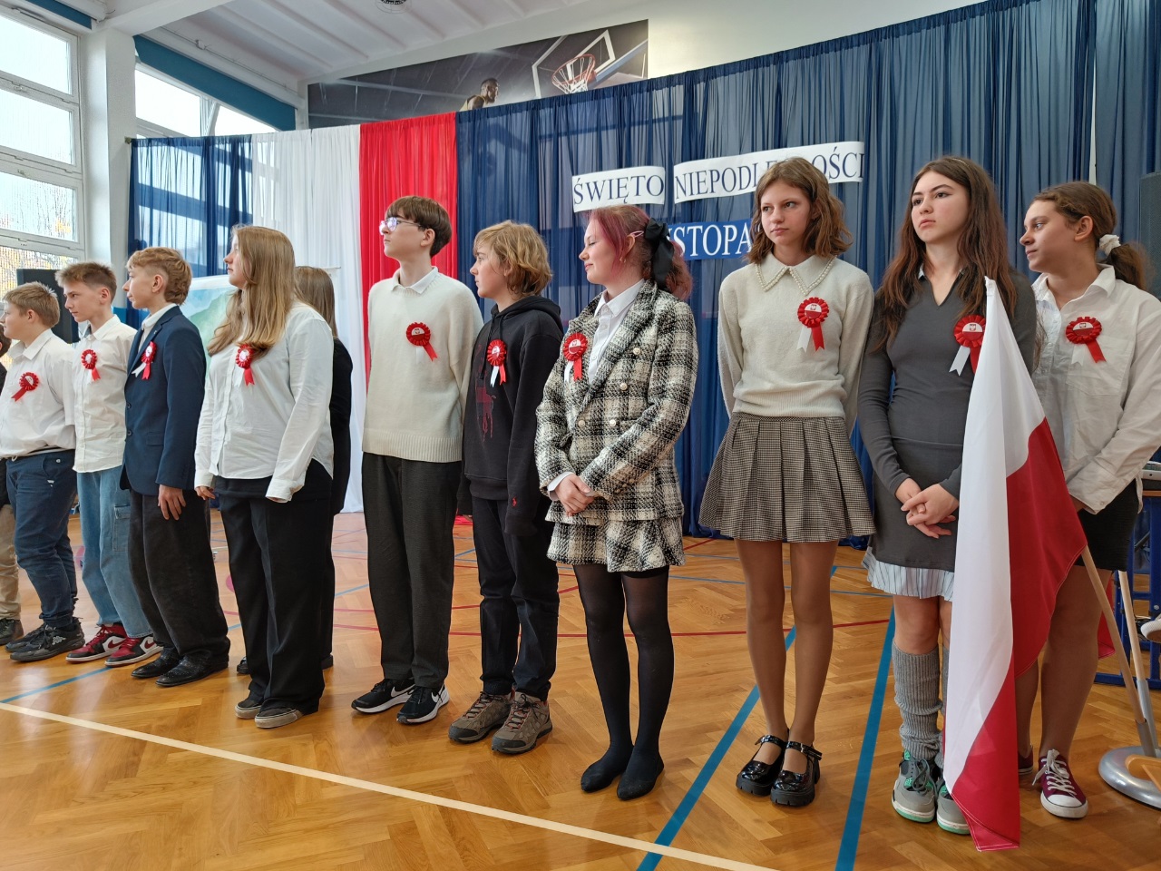 Uczniowie klasy 7a przygotowali piękny, pełen emocji i patriotyzmu apel dla klas 4-8, który upamiętnił jedno z najważniejszych wydarzeń w historii naszego kraju – odzyskanie przez Polskę niepodległości. W swoim występie przypomnieli nam, jak wielką wartością jest wolność, miłość do Ojczyzny oraz pamięć o bohaterach, którzy walczyli o niepodległą Polskę. Piękne słowa, muzyka i symbole narodowe stworzyły niezwykłą atmosferę pełną wzruszeń i dumy z bycia Polakami. Dziękujemy uczniom klasy 7a oraz ich wychowawczyni p. Kamili Dąbkowskiej za przygotowanie tej wyjątkowej lekcji historii, refleksji i miłości do Ojczyzny.