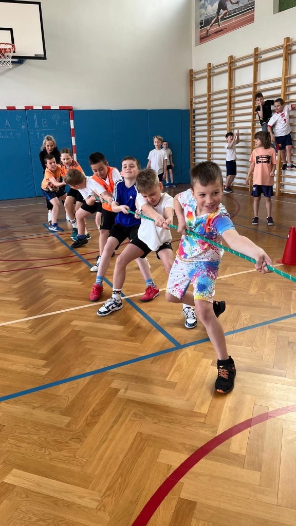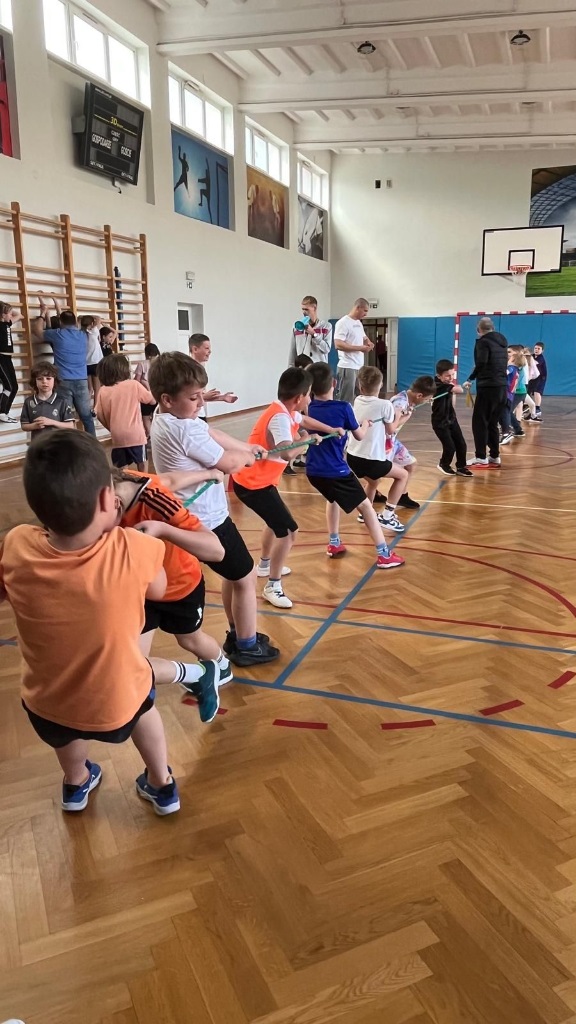 Turniej rozpoczęliśmy od wspólnej rozgrzewki, która wprowadziła wszystkich uczestników w sportowy nastrój. Następnie dzieci brały udział w różnorodnych konkurencjach – były zabawy i wyścigi rzędów, biegi, zadania z piłkami i balonami, a także emocjonujące przeciąganie liny. Każda z aktywności wywoływała mnóstwo uśmiechu i zdrowej rywalizacji.