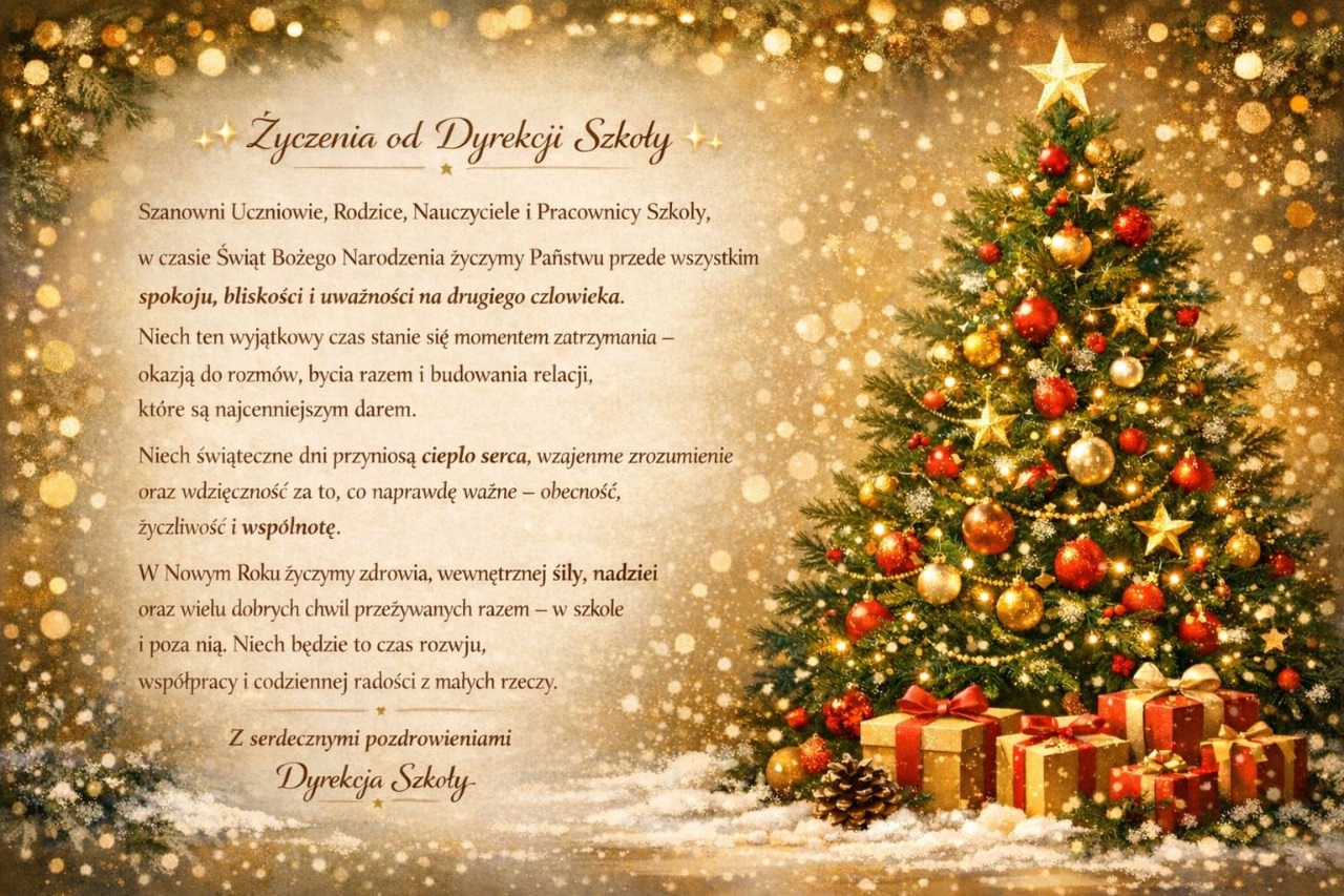 Szanowni Uczniowie, Rodzice, Nauczyciele i Pracownicy Szkoły, w czasie Świąt Bożego Narodzenia życzymy Państwu przede wszystkim spokoju, bliskości i uważności na drugiego czlowieka. Niech ten wyjątkowy czas stanie się momentem zatrzymania, okazją do rozmów, bycia razem i budowania relacji, które są najcenniejszym darem.